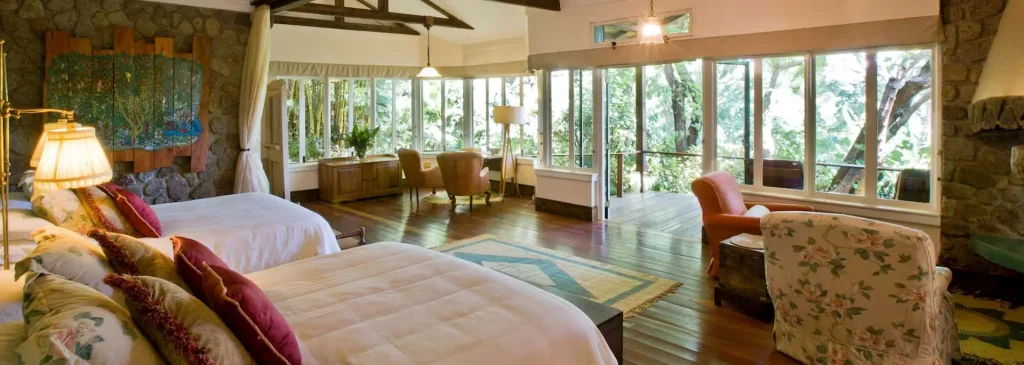 Established in the 1920s, Gibb’s Farm rests on the forested outside slopes of the Ngorongoro Crater. The property features beautifully appointed historic cottages, each uniquely decorated and boasting wraparound windows that invite the lush gardens inside.