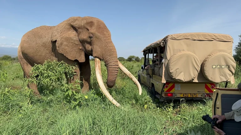 Start with morning wellness ginger shots, followed by a full-day game drive tracking giant elephant tuskers. You are supported by private safari vehicles, a luxury lounge, and a fire pit.