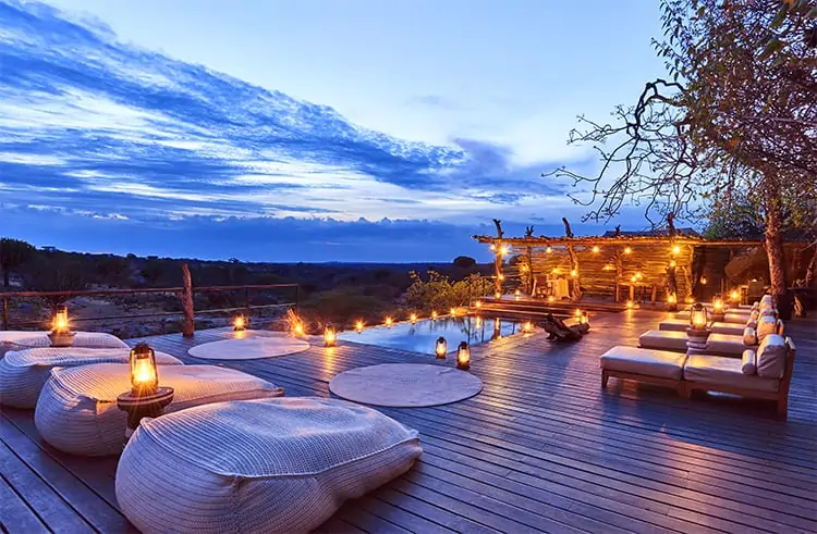 Set among massive stone boulders, ancient coral trees, and acacia woodlands overlooking a rocky gorge, Mwiba Lodge features ten ultra-luxurious tented suites. Each suite is artfully designed to blend into the dramatic landscape, featuring copper tubs, expansive decks, and unparalleled views.