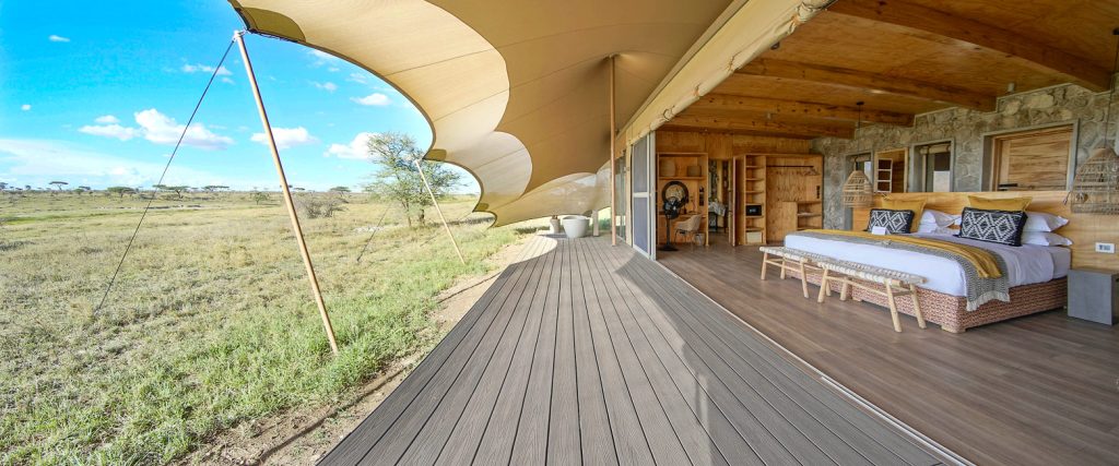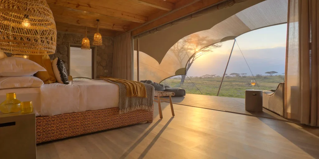 Namiri Plains offers an unparalleled level of remote luxury. Ten beautifully refined tents are pitched along the banks of an underground river. The design utilizes pale local limestone and sheer canvas to create bright, airy spaces that pull the golden savanna directly into your room. Each suite features an outdoor resin bathtub where you can soak while watching the sunset.