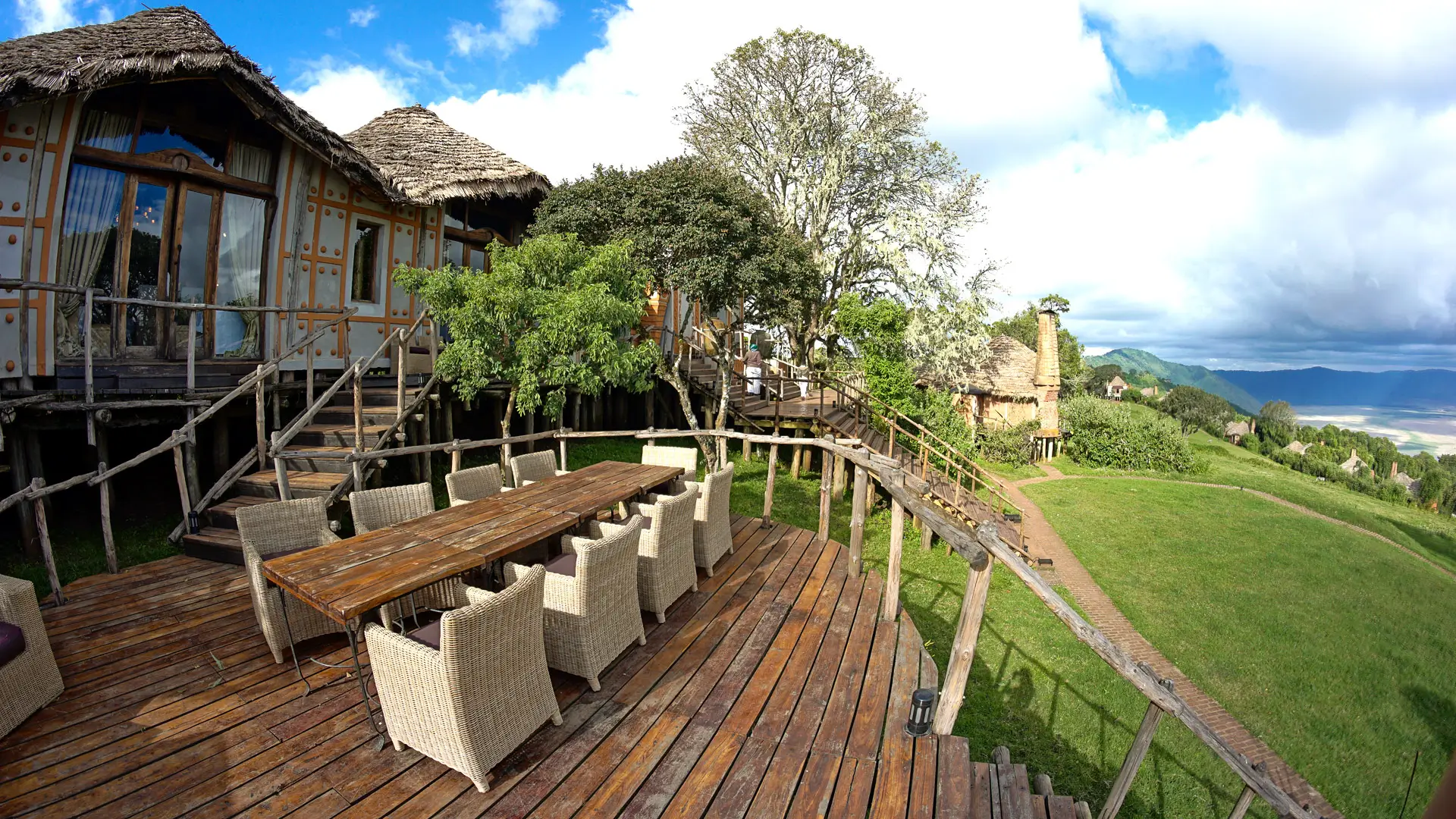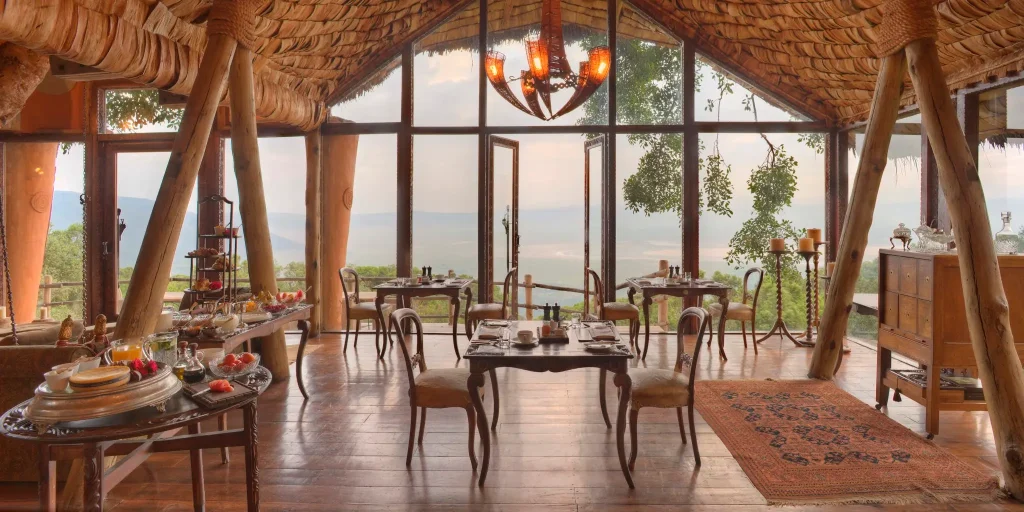 Tourist sitting and dining area at andbeyond ngorongoro crater lodge on a luxury tanznia safari